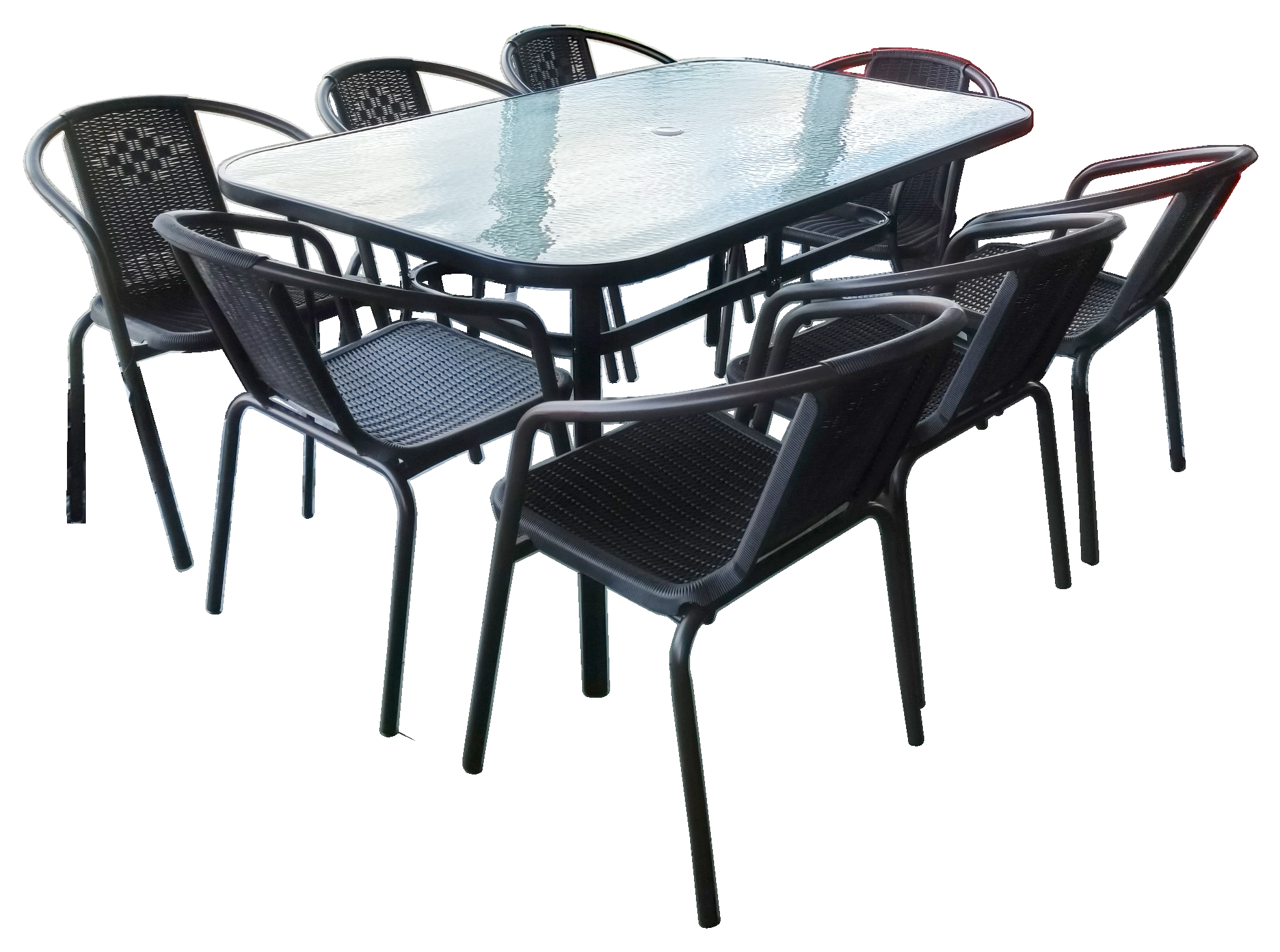 Dārza mēbeļu komplekts no 9 daļām brūnā krāsā. Komplektā ietilpst 8 krēsli un 1 galds. Galds:- Taisnstūra formas stikla virsma