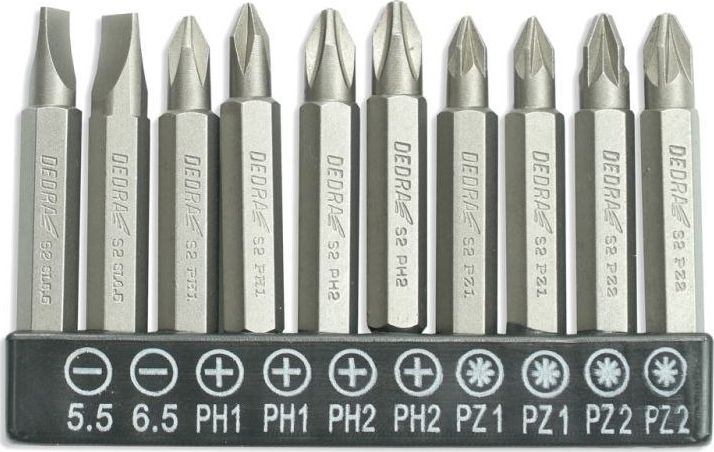 Dedra zestaw bitów 10 sztuki, 50mm: SL5.5,6.5, PH1/2-2 sztuki, PZ1/2-2 sztuki (18A07S12)