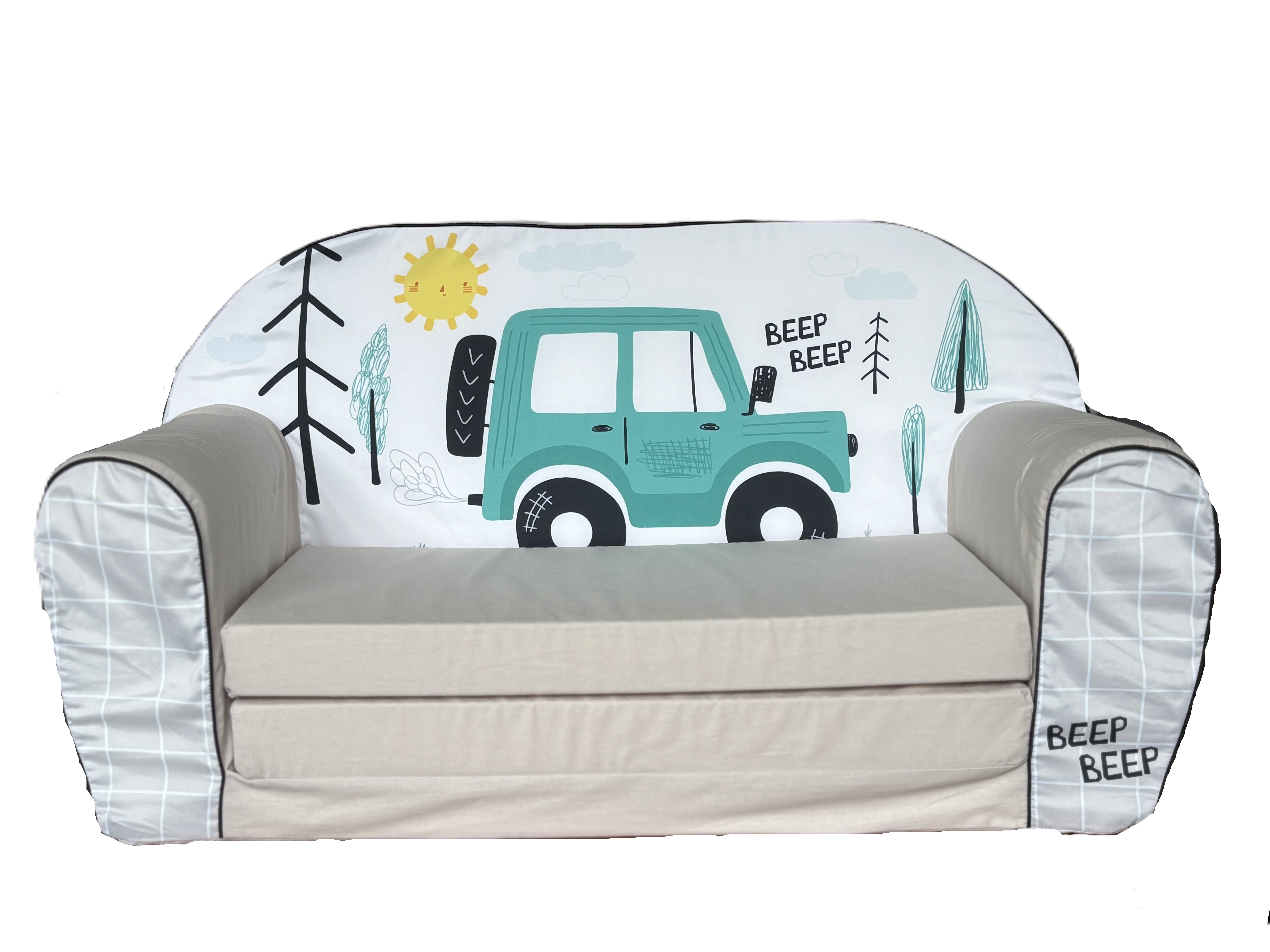 Šis rotaļīgais, saliekamais dīvāns ir izgatavots no poliuretāna putām un ir drošs, ērts sēdēšanai un arī gulēšanai.
