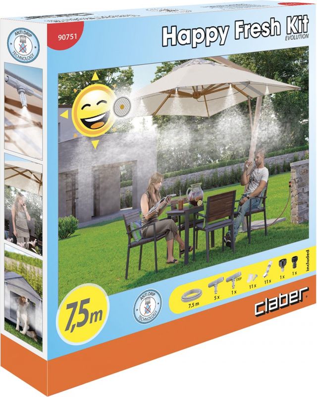 Happy Fresh ir miglošanas komplekts, kas ideāli piemērots āra telpu atdzesēšanai karstās vasaras dienās. Pateicoties mikromiglas sprauslām, mikroskopiskie ūdens pilieni, kas nonāk atmosfērā, var pazemināt temperatūru, radot labsajūtu pat karstākajās dienās. Mikromiglas smidzinātāji izlaiž gaisā mikroskopisku ūdens pilienu tvaikus, kas ļauj atdzesēt atmosfēru līdz pat 6°. Sprauslas var viegli piestiprināt pie nojumēm, lapenēm un saulessargiem. Darba spiediens: 3-6 bar. Komplektā iekļauts: - 7,5 m šļūtene,