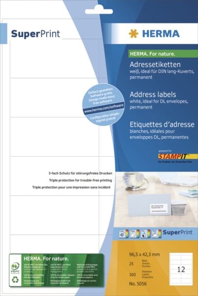 HERMA Labels Premium A4 97x42.3 mm white paper matt 300 pcs.. Product colour: White, Label type: Self-adhesive printer label, Format: A4. Label width: 9.7 cm, Label height: 4.23 cm. Package width: 212 mm, Package depth: 8 mm, Package height: 325 mm. Labels per pack: 300 pc(s), Media sheets per package: 25 sheets, Labels per sheet: 12 pc(s). Country of origin: Germany, Technical features: border on all sides