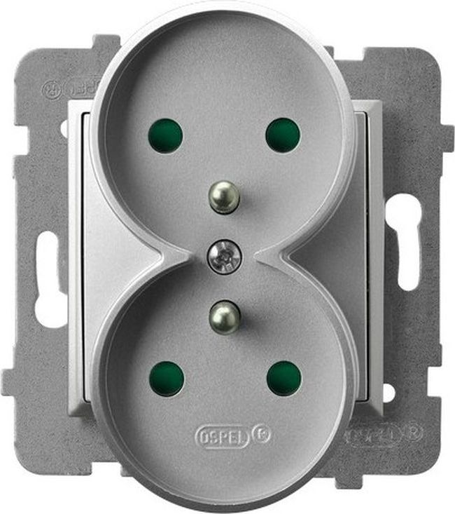 Ospel ARIA Gniazdo podwójne z/u z przesonami torów prdowych srebro GP-2URZP/m/18