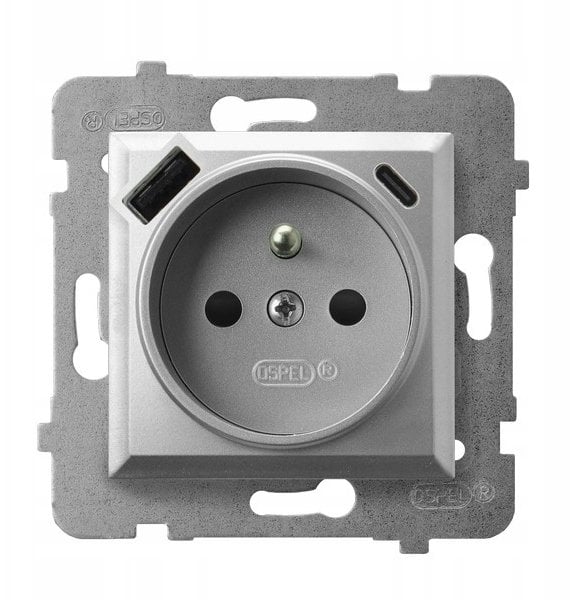Ospel Gniazdo pojedyncze z uziemieniem z przesonami torów prdowych, z adowark USB A+C srebro GP-1UZPUSBAC/m/18