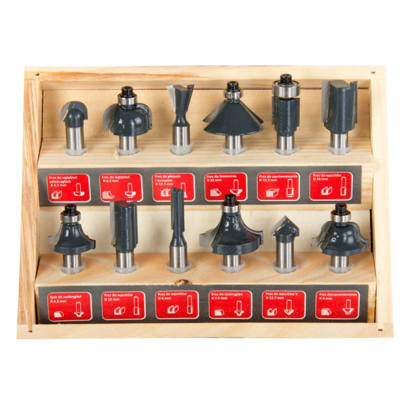 | Profilfrēžu komplekts kokam ar 8 mm savienojumu. Komplektā ietilpst iegremdējamais griezējs 6.3 mm, rievu griezējs 6 mm, gala frēze malu noapaļošanai 6.3 mm, griezējs gludināšanai 12.7 mm, rievu griezējs 12 mm, griezējs dīgļa atslēgām 12.7 mm, lodīšu griezējs 6.3 mm. |