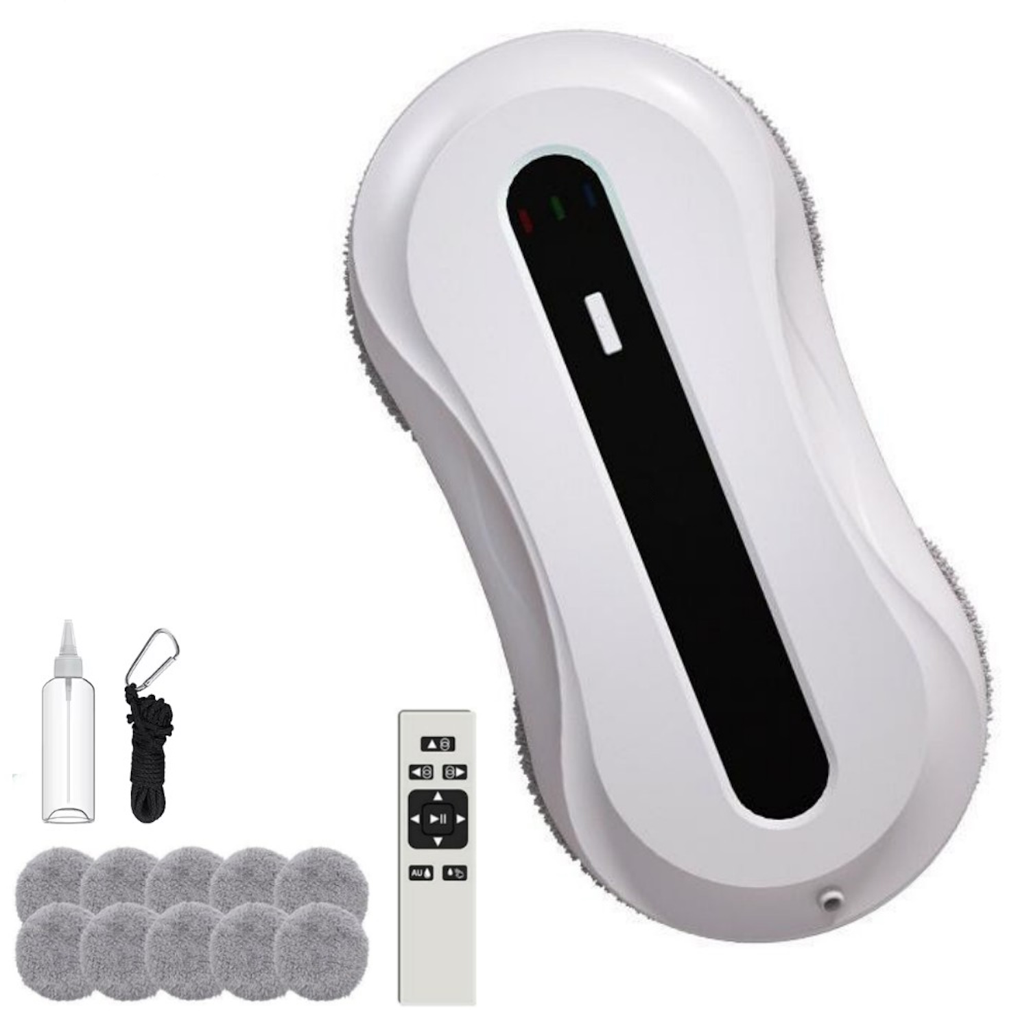 Iepakojuma saturs: Logu tīrīšanas robots Mikrošķiedras tīrīšanas spilventiņi (10 gab.) Tīrīšanas gredzeni (4 gab.) Ūdens uzpildes pudele Strāvas adapteris ar vadu Drošības virve Tālvadības pults AAA baterijas (2 gab.) |