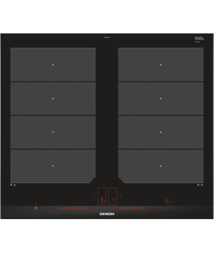 | Siemens EX675LXC1E. Product colour: Black, Stainless steel, Appliance placement: Built-in, Hob type: Zone induction hob. Simmer cooking zone: 3700 W, Regular cooking zone: 3700 W. Control type: Touch, Control position: Top front. Connected load (electric): 7400 W, AC input voltage: 220-240 V, AC input frequency: 50 - 60 Hz. Width: 602 mm, Depth: 520 mm, Height: 51 mm |