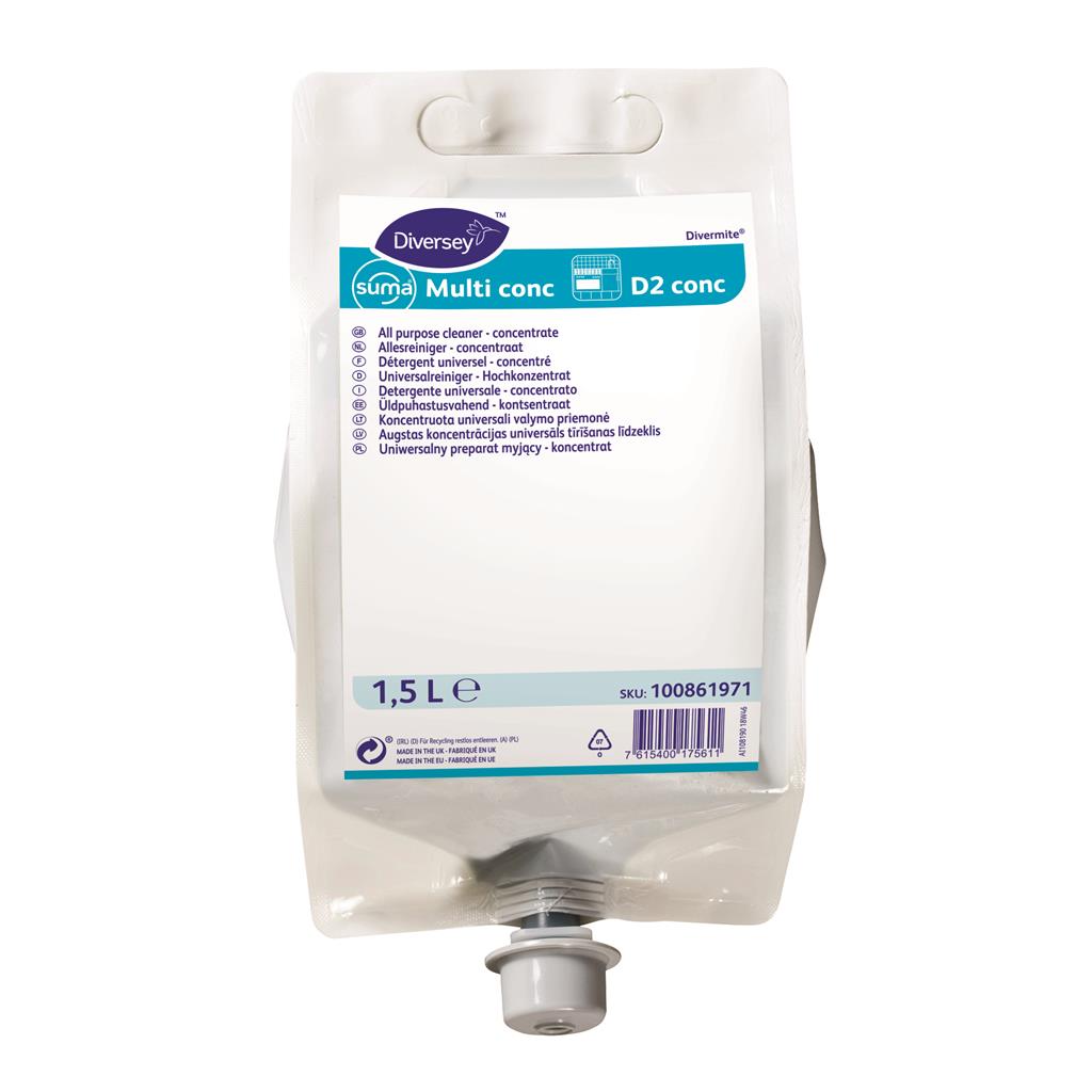 | Suma Multi-conc D2 conc ir ļoti koncentrēts mazgāšanas līdzeklis cietu virsmu tīrīšanai ar pārtiku saistītās telpās, ieskaitot grīdas, sienas, durvis, griestus un vispārējo aprīkojumu. Suma Multi conc D2 mūsu Divermite maisiņos lietošanai Diverseys dozēšanas un atšķaidīšanas platformās, lai uzlabotu lietotāju drošību un novērstu pārdozēšanu. Ļoti koncentrēts sastāvs nodrošina ekonomiju lietošanā. Noņem taukus un uzkaltušus pārtikas netīrumus. Efektīva visos ūdens cietībās pakāpes. Daudzfunkcionāls lietošanai uz vairuma virsmu, izņemot pulētu alumīniju. pH 11 |