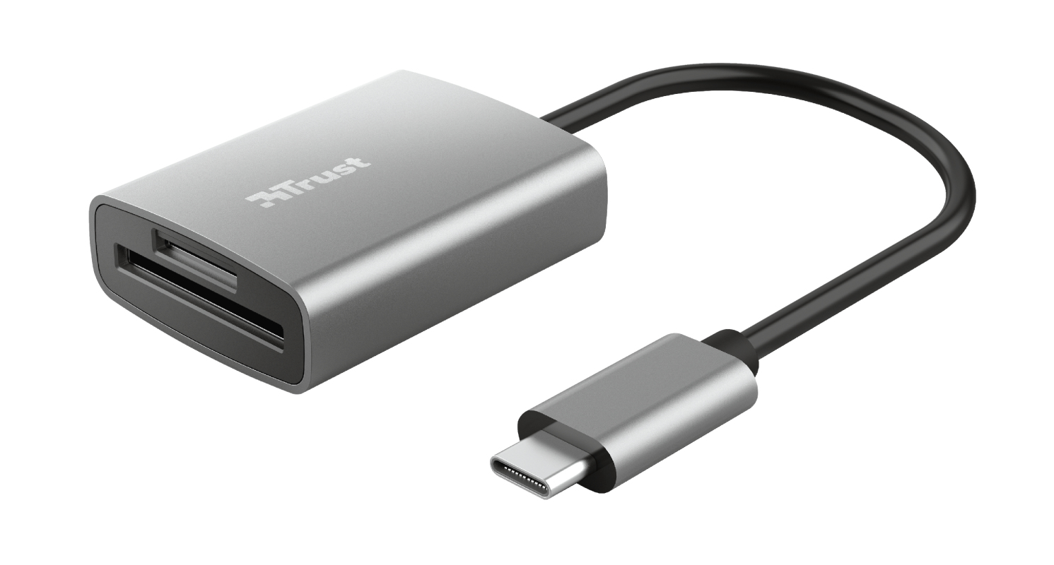 Trust 24136. Compatible memory cards: MicroSD (TransFlash), SD, SDHC, SDXC, Product colour: Aluminium, Data transfer rate: 140 Mbit/s. Interface type: USB 3.2 Gen 1 (3.1 Gen 1) Type-C. Width: 34 mm, Depth: 14 mm, Height: 44 mm. Quantity per pack: 1 pc(s)