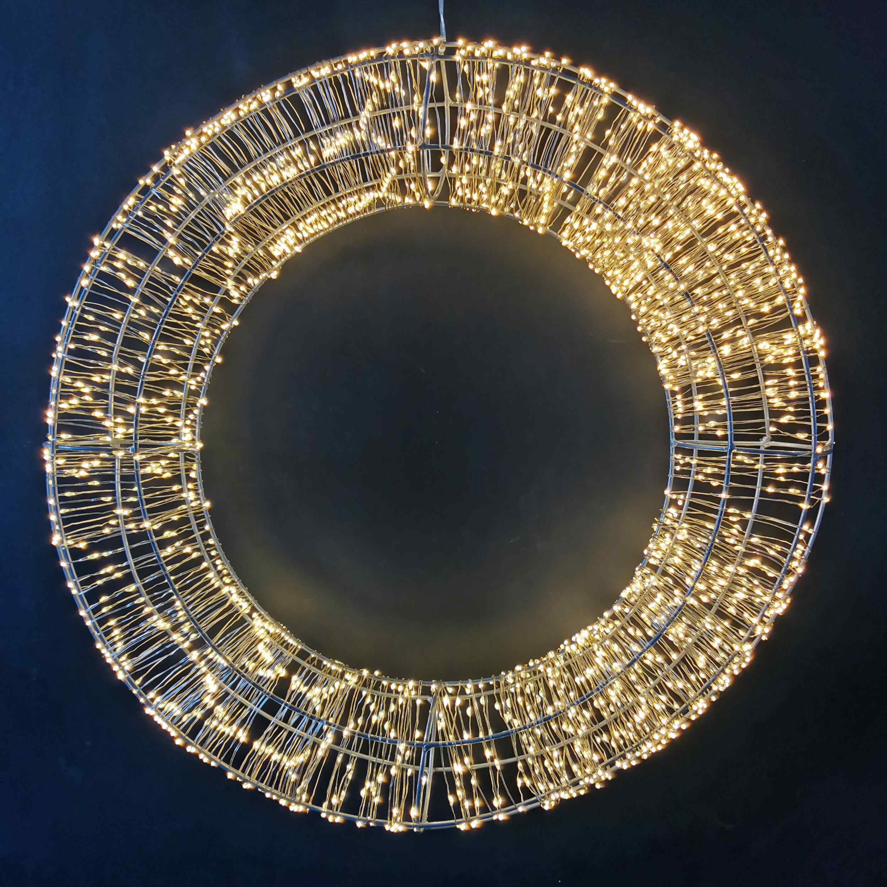 Ziemassvētku dekors vainags no metāla stieplēm un microLED virtenes ar 800 silti baltām gaismas diodēm. Vainaga diametrs 30 cm.