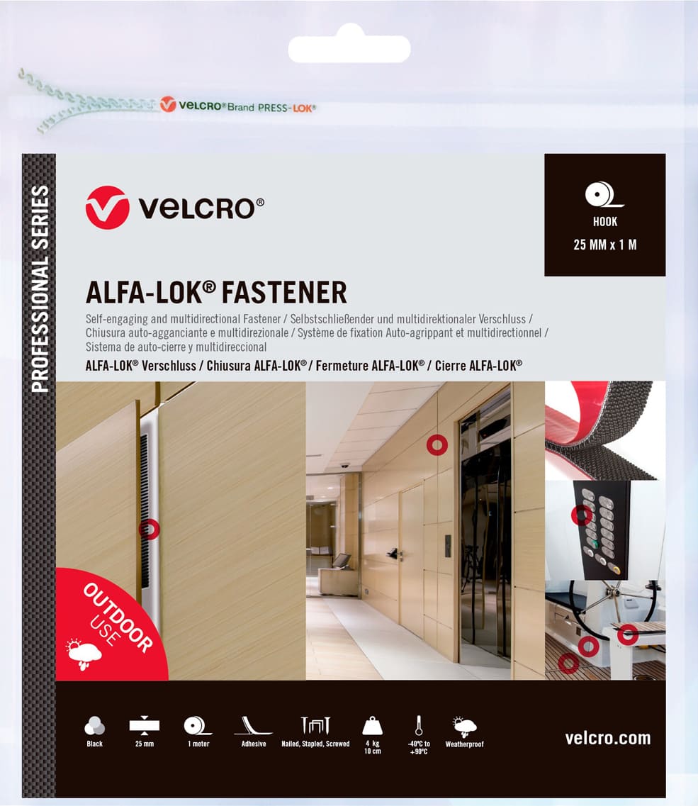 Der ALFA-LOK® Verschluss ist ein starkes, in sich selbst schließendes Band, das einfach in der Verwendung ist. Die Pilzkopfform mit 4 Haftpunkten gewährleistet eine feste und zuverlässige Verbindung. Unser ALFA-LOK® Verschluss ist multidirektional: er kann in jeder Position ineinander greifen, indem man die zwei Seiten fest zusammendrückt. ALFA-LOK® Verschlüsse wurden für den Einsatz in einer großen Auswahl an Anwendungen entwickelt. Dazu gehören unter anderem Solarpanele, Beschilderung und Messestände sowie das Fixieren von Innenausstattung in Zügen, Autos oder Bussen.- MATERIAL: Polyester Polypropylen