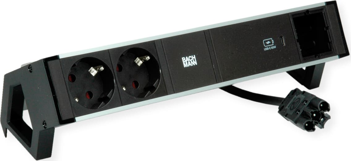DESK2 ALU BLACK multiple socket outlet with enhanced touch protection 2xprotective contact sockets 35° black 1xUSB C 60W Charger 1xcustom module empty Supply cable 0.2m H05VV-F3G1.5mm² black with GST18 plug Profile: anodised aluminium (natural) End caps: Black plastic incl. mounting brackets with Bachmann logo packed in cardboard box