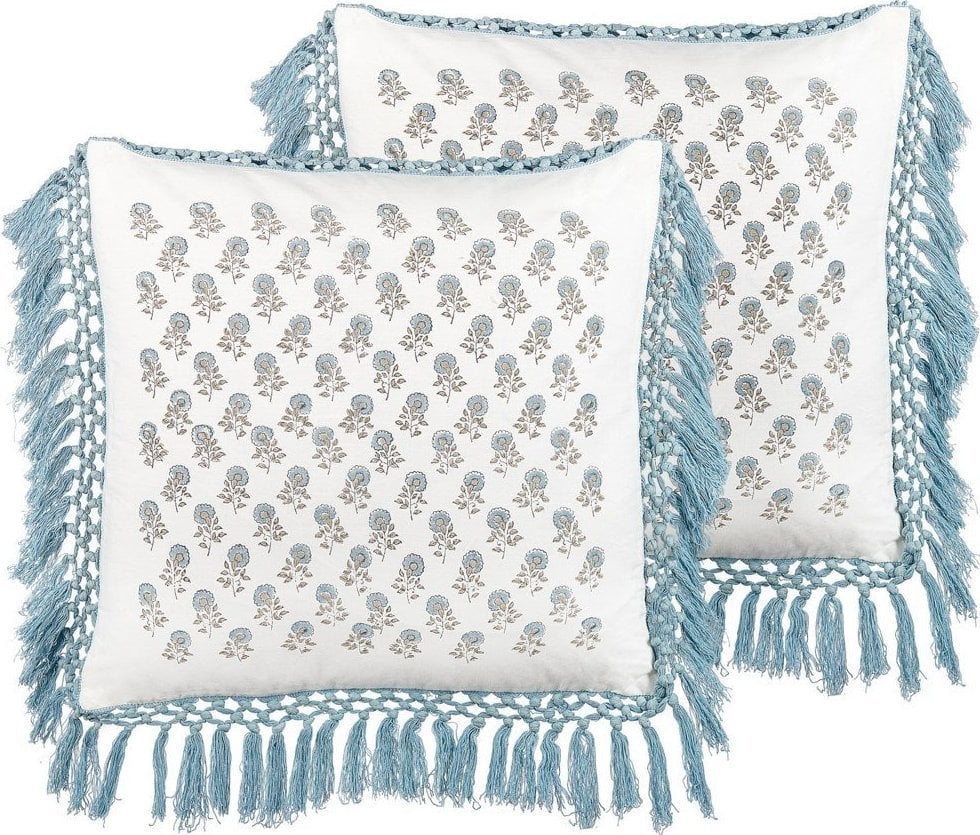 Beliani 2 baweniane poduszki dekoracyjne w kwiaty z frdzlami 45 x 45 cm biao-niebieskie PALLIDA!