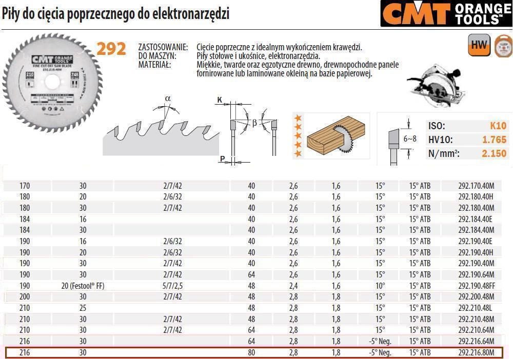 CMT PIA DO CICIA POPRZECZNEGO, OBRÓBKA WYKACZAJCA HM 216x30x2,8/1,8 Z=80 CMT292.216.80M