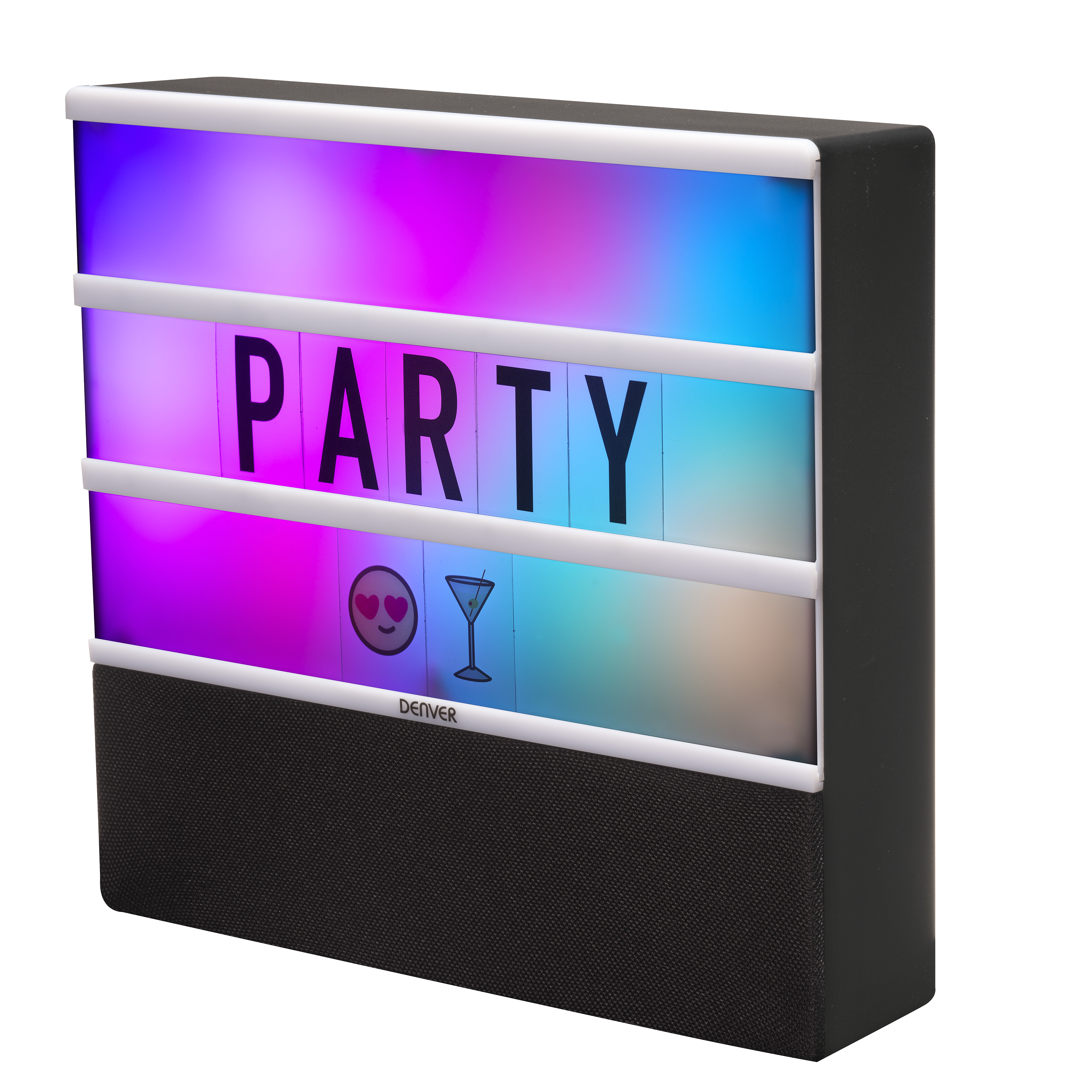 | Bluetooth skaļrunis Vienkārši savienojiet pārī ar viedtālruni vai datoru ar Bluetooth savienojumu un atskaņojiet mūziku bezvadu režīmā Iebūvēts ziņojumapmaiņas dēlis, kurā var ievietot burtus, ciparus un simbolus (iekļauti 100 gab.) RGB LED fona apgaismojums ar dažādiem gaismas režīmiem + izslēgts režīms Bluetooth darbības rādiuss 8-10 metri Strāvas padeve: iebūvēts uzlādējams akumulators (uzlādē, izmantojot USB kabeli) Izmērs (P x A x D): 23,5 x 22 x 5,6 cm Svars: 700 grami | Tips | Bluetooth skaļrunis | | FM radio | Nē | | Bluetooth | + | | AUX ieeja | - | | USB ieeja | - | | Mikrofona ieeja | - | | Kartes slots | Nē | | Karaoke | - | | Mikrofons | - | | Iebūvēts akumulators | + | | Strāvas padeve | USB | | LED apgaismojums | + | | Iebūvets ratiņu rokturis | - | | Krāsa | Melna, daudzkrāsaina | | Izmērs | 23.5 x 22 x 5.6 cm | | Svars (kg) | 0.7 | |