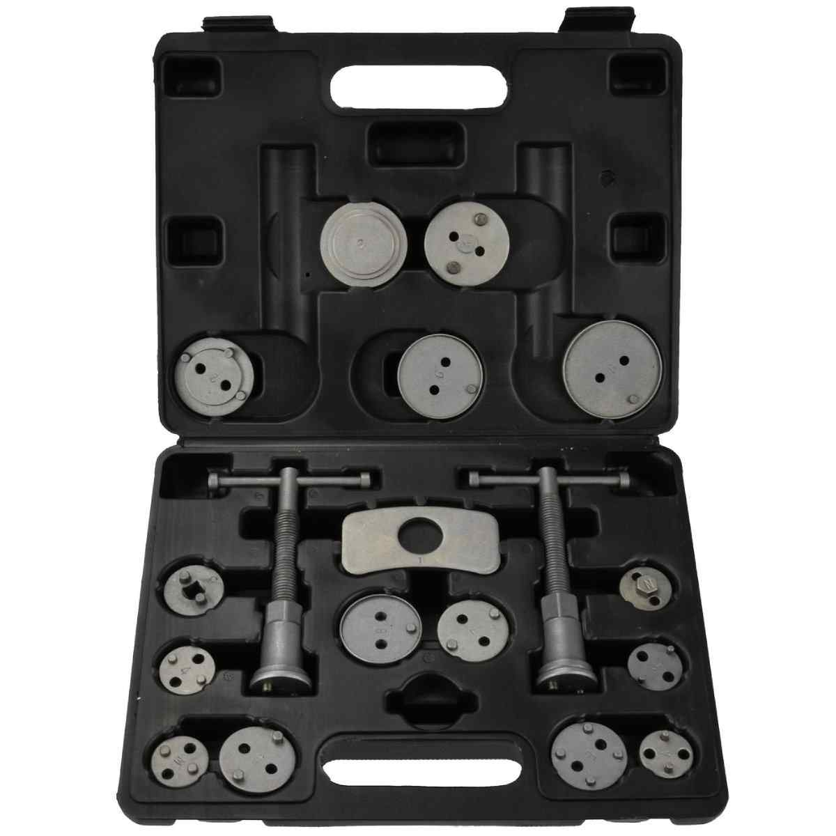 rofesionāls 18 daļu komplekts bremžu virzuļu ievilkšanai / izspiešanai, neaizstājams ar disku bremzēm aprīkotu transportlīdzekļu remontam. Komplekta saturs:- Labās puses prese ar magnētisko fiksatoru