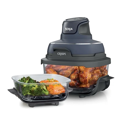 Ninja CRISPI 4-in-1 ir moderns un kompakts karstā gaisa fritieris ar stikla trauku, kas apvieno četras funkcijas vienā ierīcē – cepšana, sildīšana, kraukšķināšana un īpaši kraukšķīga apstrāde augstā temperatūrā. Tas ir ideāls risinājums mazām virtuvēm, studentiem vai ceļošanai, pateicoties tā pārnēsājamam dizainam un stikla traukiem, kurus var izmantot ne tikai gatavošanai, bet arī ēdiena uzglabāšanai un uzsildīšanai.