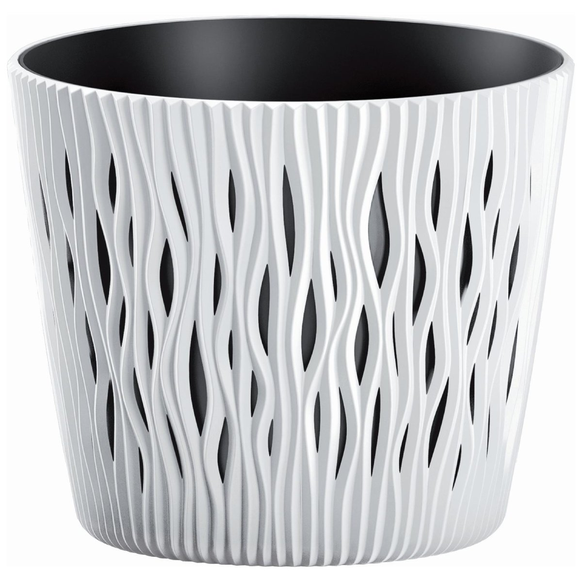 Puķu pods izgatavots no kvalitatīvas plastmasas, tas ir viegls un vienlaikus izturīgs. Puķu poda unikālo dizainu veido ar izgriezumiem dekorēts matēts ārējais puķu pods un melnais ieliktnis. Puķu pods ir UV un sala izturīgs.
