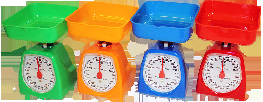 Mehāniskie virtuves svari oranžā krāsā. Korpuss un svēršanas trauks izgatavoti no plastmasas. Maksimālais svars 5 kg, svēršanas precizitāte +/- 40 g.