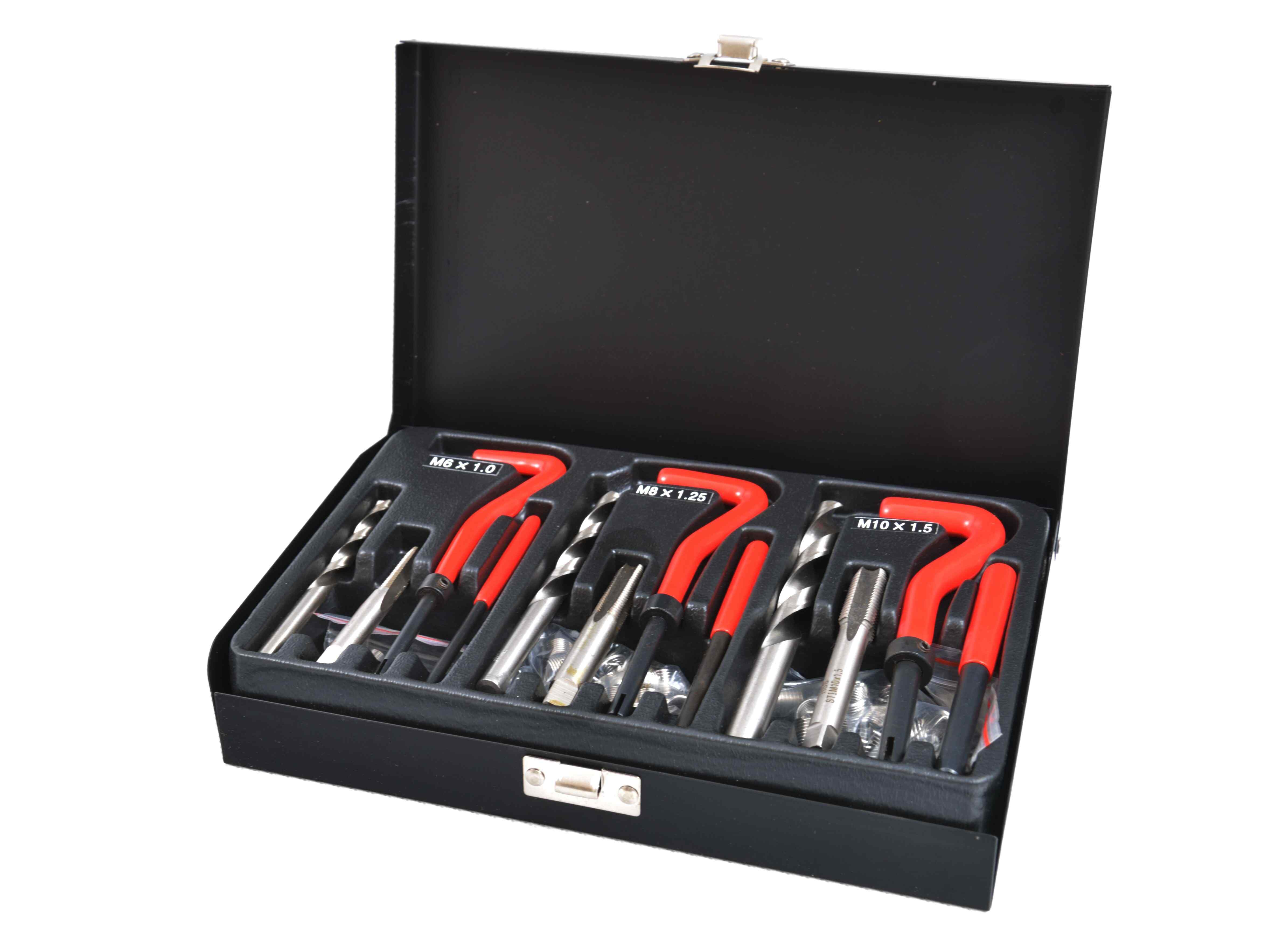 Komplekts M6, M8, M10 vītņu remontam un atjaunošanai. Vienpakāpju krāni nogriež vītni, kurā ir ievietots ciets nerūsējošā tērauda spirālveida ieliktnis. Ieliktņa ievietošanai tiek izmantota vadpoga un trieciens, kas nolauž ieliktņa izvirzīto galu. Komplektā ietilpst:- Urbji bojātās vītnes rīvēšanai 3 gab