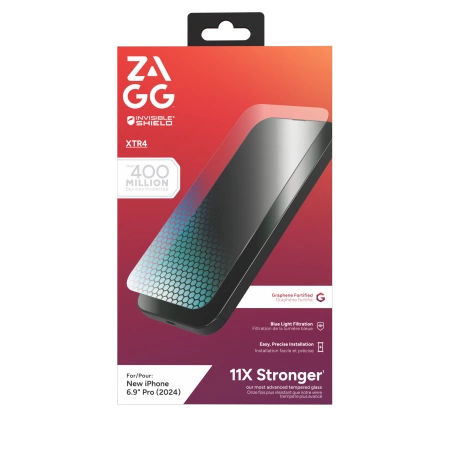 | 11X STRONGER XTR4 is ZAGGâs strongest, most technologically advanced screen protection. Reinforced with graphene â one of the strongest materials in the world, it has been tested up to 11 times stronger than traditional glass screen protection. IMPROVED EYE COMFORT AND SLEEP XTR4 is the worldâs first screen protection with Radiance Protection Factor 60 technology, which filters out blue light that can disrupt sleep. BETTER COLOUR REPRODUCTION Anti-reflective technology increases light transmission, improving screen clarity and enriching colours with deeper blacks, true blues and more vibrant reds. INCREASED SCRATCH PROTECTION XTR4 glass has a surface coated with nano-additives, making it incredibly hard and scratch resistant. MAXIMUM TOUCH SENSITIVITY The XTR4 features a SiO2-enhanced coating for maximum touch sensitivity and an incredibly smooth surface for fast, frictionless gliding, making it ideal for gamers. EASY, DUST-FREE INSTALLATION Applying the XTR4 is a snap. It comes with anti-dust adhesive and an EZ Apply installation tray so you can be sure the glass is perfectly aligned when applying to your screen. ANTIBACTERIAL COATING The antibacterial coating protects the screen protector from degradation by microorganisms. TÃV RHEINLAND GREEN MARK CERTIFIED PRODUCT The XTR4 is made from 30% post-consumer glass, its mounting tray is made from 100% recycled materials, and its packaging is 100% recyclable. FSC CERTIFICATE XTR4 packaging is certified by FSC, an organization working to protect healthy forests. |
