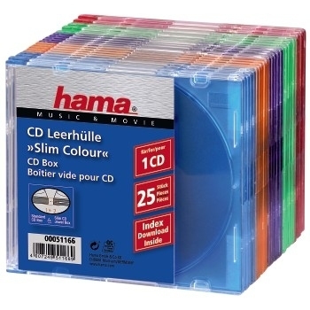 Hama CD Slim Box Pack of 25, Coloured. CD capacity: 1 discs, Product colour: Multicolour, Material: Plastic