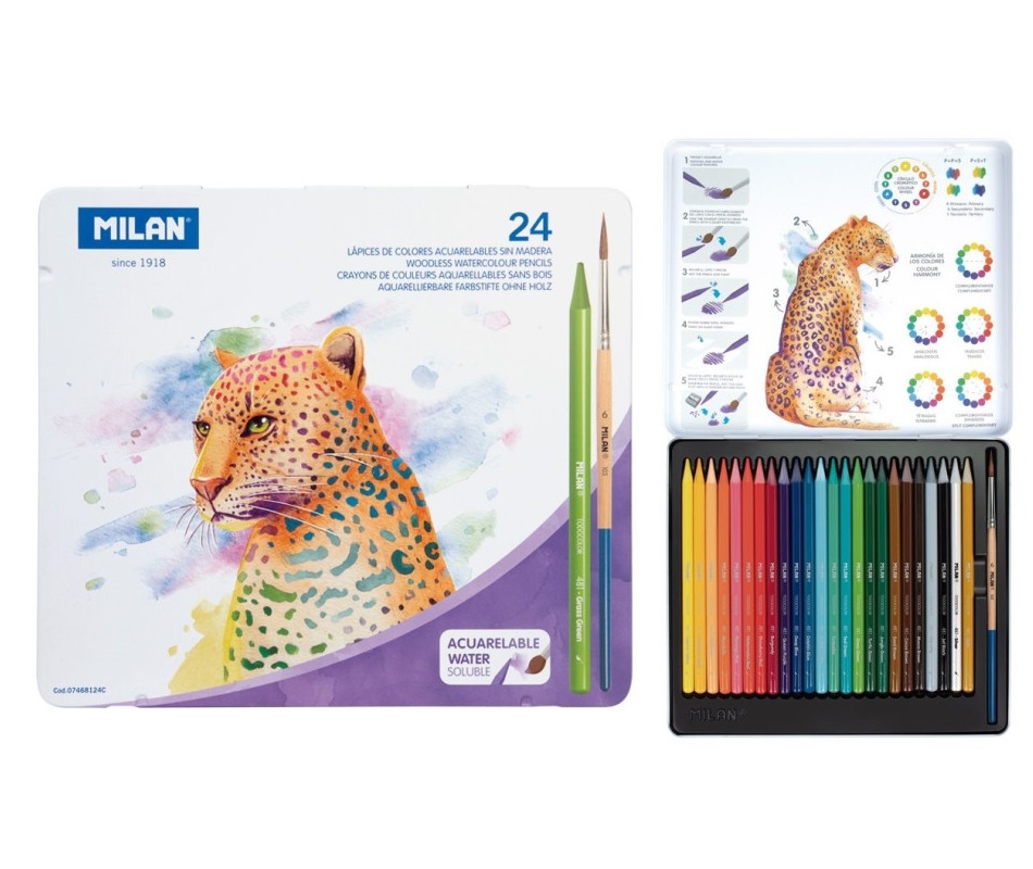 Watercolor Pencils, 24 colors, packed in a metal case. These pencils can be used dry or with water to create smooth watercolor effects and soft color transitions.