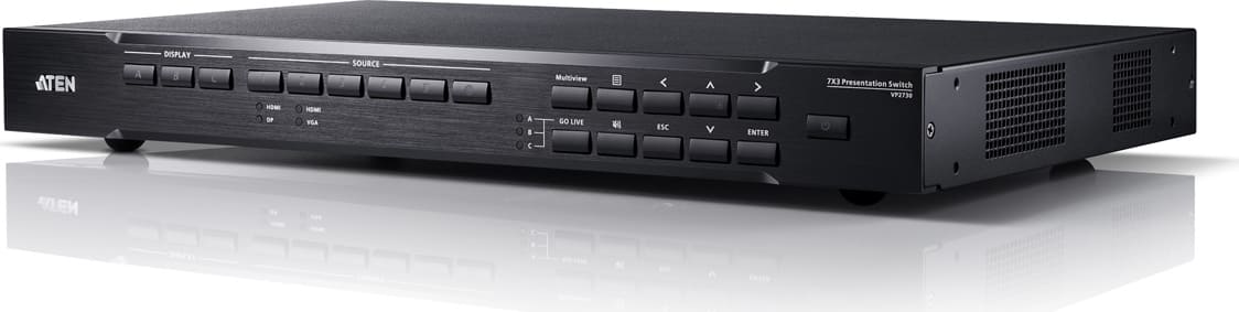 Der VP2730 ist ein Multi-in-One Switch für Präsentationen, der Video Matrix Switch mit Scaler-, Streaming-, Audio Mixer-, HDBaseT-Extender- und Analog-Digital-Wandler-Funktionen in einem kompakten Gerät integriert.Mit sieben Multiformat-Eingängen für zwei HDMI- und einen HDBaseT High-Definition Ausgang ermöglicht der VP2730 größere Besprechungen und erleichtert die Zusammenarbeit zwischen lokalen und entfernten Teilnehmern in Sitzungsräumen, Videokonferenzräumen, Hörsälen oder beim Fernunterricht.