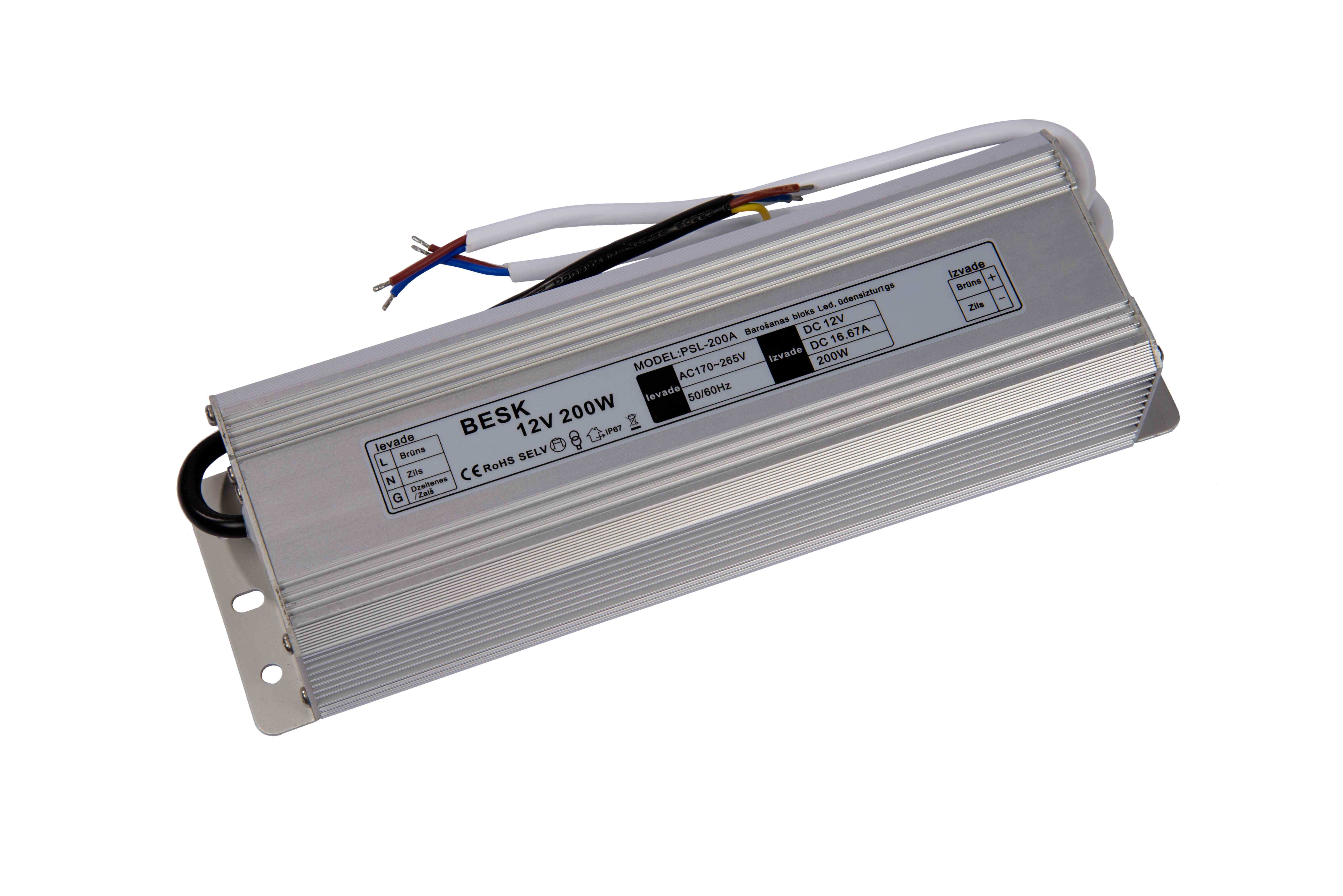 Ievade līdzstrāva AC 170-265 V, 50/60 Hz. Izvade maiņstrāva DC 12 V, 16.67 A, 200 W. Ūdensizturīgs, IP67.