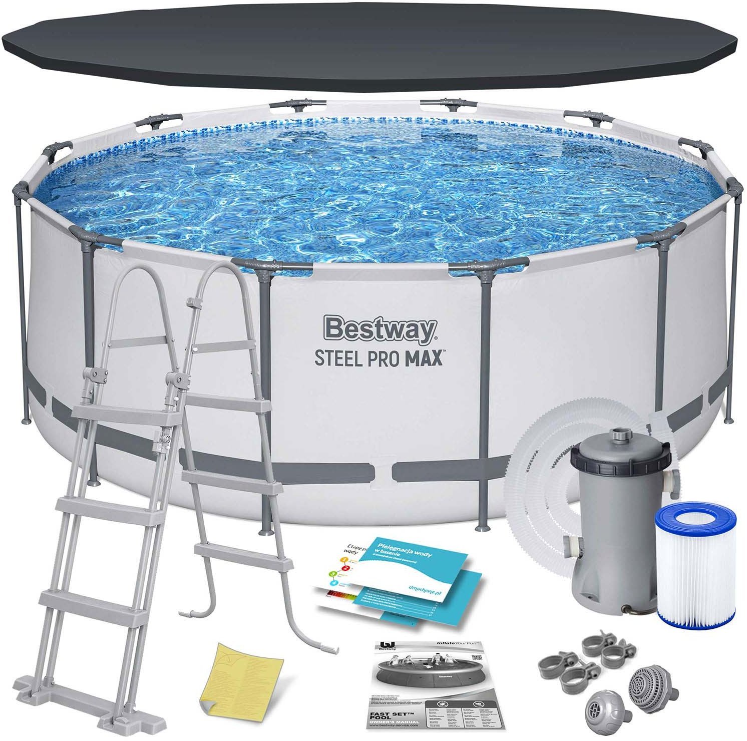 Steel ProMAX™ Frame Pool Komplektā ietilpst 530 galonu stundā filtra sūknis, lai jūsu ūdens būtu svaigs un tīrs. Komplektā ietilpst arī baseina pārsegs un baseina kāpnes.