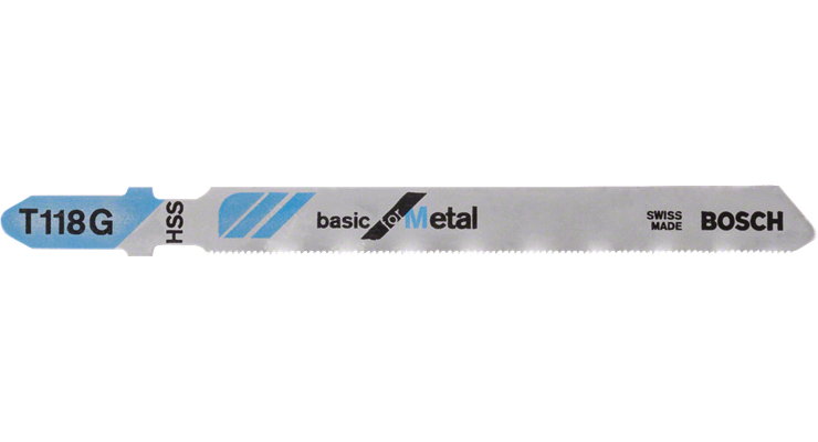 Bosch T 118 G Basic for Metal Jigsaw Blades. Product type: Jigsaw blade, Suitable for materials: Sheet metal (very thin), Blade material: High-Speed Steel (HSS). Blade tooth spacing: 0.7 mm. Overall length: 9.2 cm. Quantity per pack: 5 pc(s)