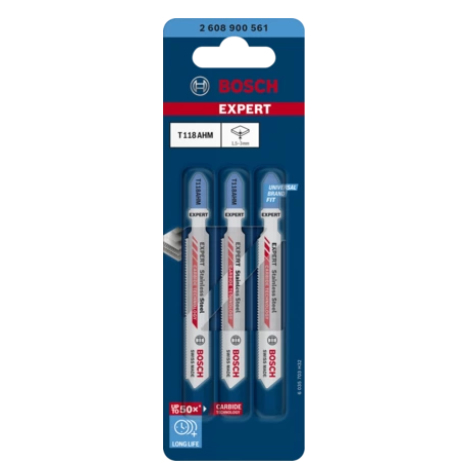 Bosch 2 608 900 561. Product type: Jigsaw blade, Suitable for materials: Stainless steel, Blade material: Carbide. Blade tooth spacing: 1.1 mm, Cutting thickness (max): 3 mm. Overall length: 8.3 cm. Quantity per pack: 3 pc(s)