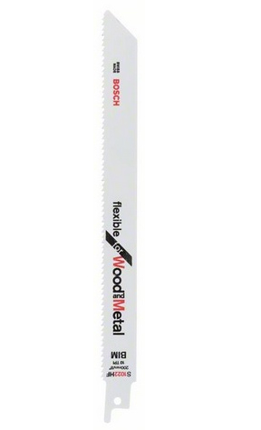 Bosch S 1022 HF. Product type: Sabre saw blade, Suitable for materials: Pipe, Profile, Sheet metal, Wood with nails, Blade material: Bimetal. Blade tooth spacing: 2.5 mm, Cutting thickness (max): 15 cm. Overall length: 20 cm. Quantity per pack: 1 pc(s)