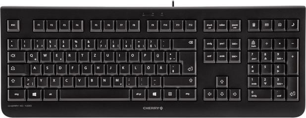 CHERRY KC 1000. Tastatūras formas standarts: Pilns izmērs (100%). Tastatūras veids: Taisni. Savienojamības tehnoloģija: Vadu, Ierīces interfeiss: USB, Tastatūras izkārtojums: QWERTY, Tastatūras taustiņu skaits: 105. Kabeļa garums: 1,8 m. Ieteicamais pielietojums: Birojs. Produkta krāsa: Melns