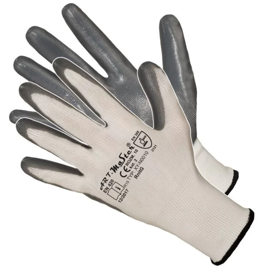 Aizsargcimdi, izgatavoti no balta trikotāžas poliestera, pārklāti ar pelēku nitrilu, bezšuvju. Tie nodrošina stingru satvērienu, nitrila pārklājums palielina izturību pret taukiem, eļļu un samazina netīrumu iekļūšanu. CE sertifikāta 2. kat. EN 388:2016 (2.1.1.1.X), EN 420:2003+A1:2009.