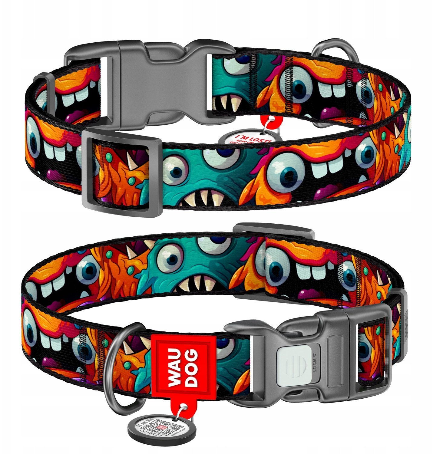 Collar WauDog Nylon Obroa nylonowa z QR-paszportem, plastikowy fastex, wzór ZBATE POTWORY, S 15mm/25-35cm