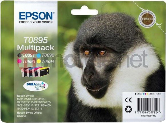 Epson Monkey Multipack 4-colours T0895 DURABrite Ultra Ink. Black ink volume: 5.8 ml, Supply type: Multi pack, Colour ink volume: 3.5 ml, Quantity per pack: 1 pc(s)