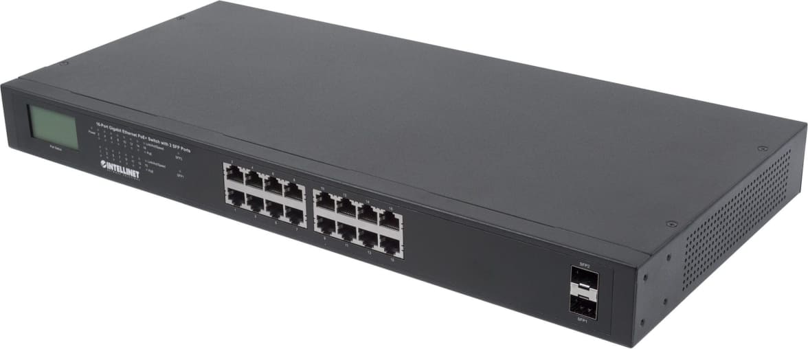 Intellinet 561259. Slēdža tips: Nepārvaldīts. Basic switching RJ-45 Ethernet portu veids: Gigabit Ethernet (10/100/1000), Basic switching RJ-45 Ethernet portu daudzums: 16. Pilns duplekss. Adrešu tabulas izmērs: 8192 ieraksti, Komutācijas ietilpība: 36 Gbit/s. Tīkla standarts: IEEE 802.3, IEEE 802.3ab, IEEE 802.3af, IEEE 802.3at, IEEE 802.3az, IEEE 802.3u, IEEE 802.3x. Power over Ethernet (PoE). Statņa montāža