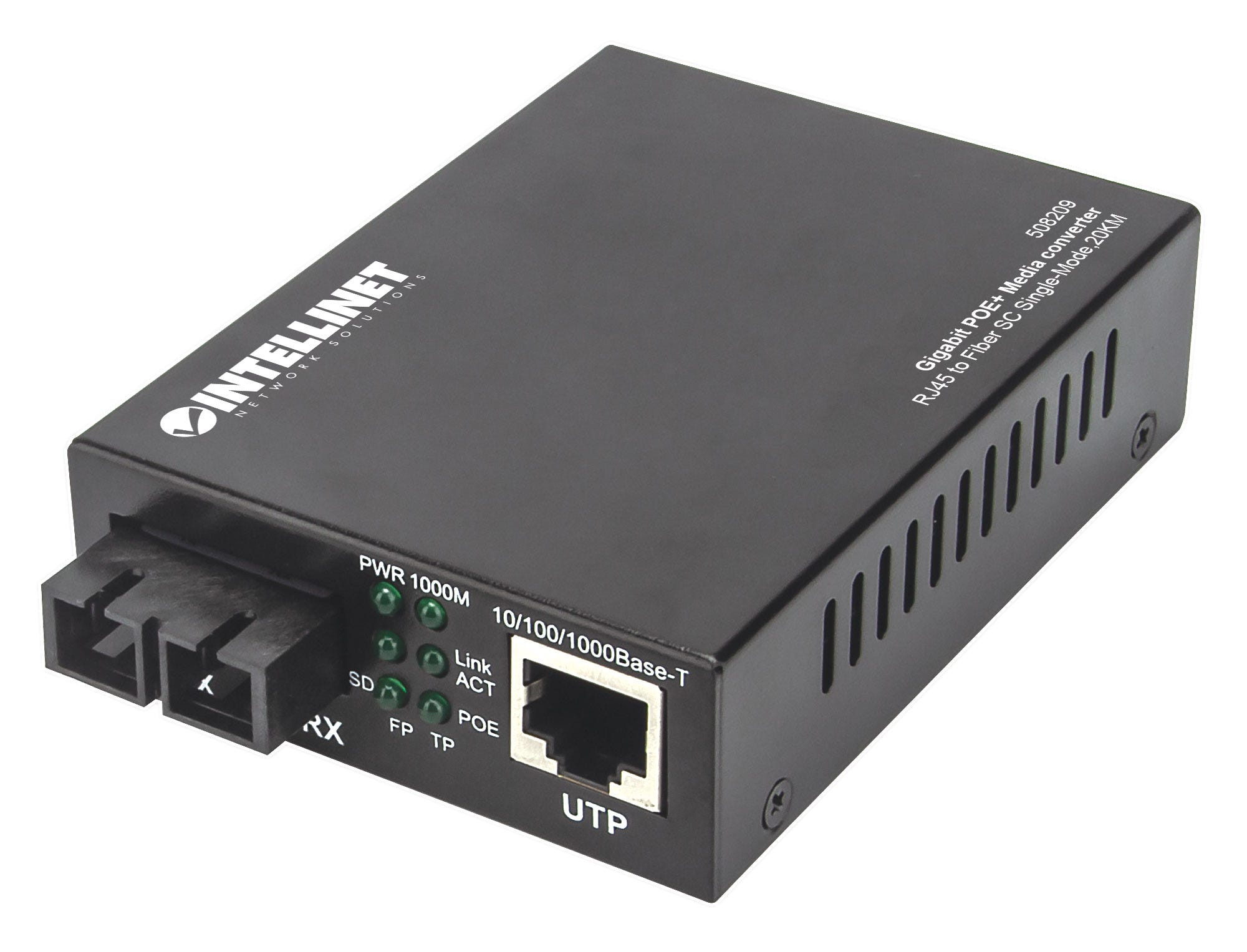 | Intellinet Gigabit PoE+ Media Converter, 1000Base-T RJ45 Port to 1000Base-LX (SC) Single-Mode, 20 km (12.4 mi.), PoE+ Injector (Euro 2-pin plug). Maximum data transfer rate: 1000 Mbit/s, Converter input interface: 1000Base-T, Converter output interface: 1000Base-LX. Fiber optic connector: SC, Connectivity technology: Wired. Maximum transfer distance: 20000 m, Wavelength: 1310 nm, Fiber mode structure: Single-mode. LED indicators: Activity, Link, PoE, Power, Product colour: Black, Housing material: Metal. Input voltage: 56 V, Input current: 0.5 A, Total Power over Ethernet (PoE) budget: 30 W |