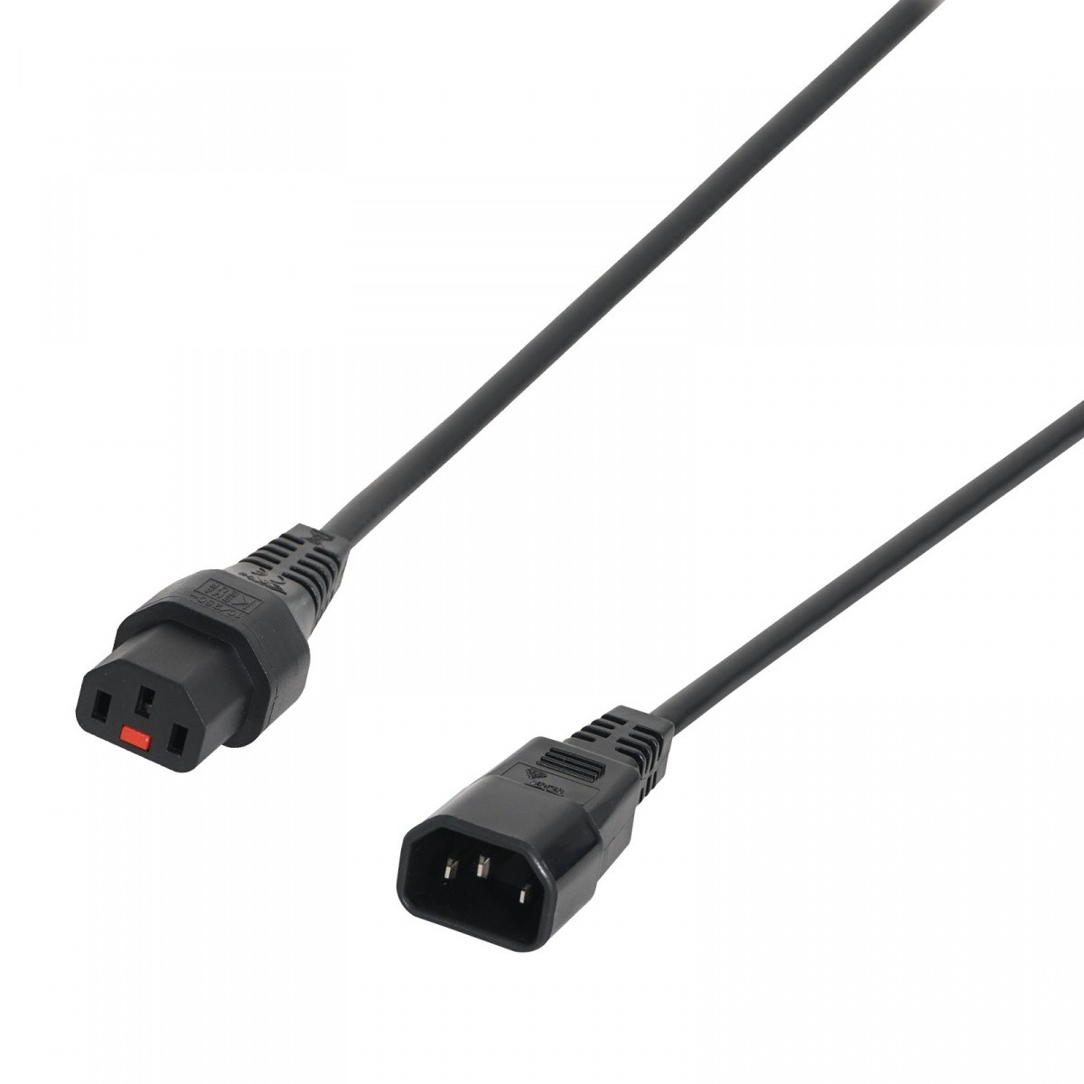 Przewód o długości 5m w kolorze czarnym, posiadający złącze proste IEC C14 oraz proste IEC C13, wyposażony w system blokujący IEC LOCK. Zastosowanie takiego przewodu zabezpiecza każde podłączone do niego urządzenie przed nagłą utratą zasilania w wyniku przypadkowego wypięcia, wibracji lub innych działań. Niewątpliwą zaletą systemu IEC LOCK jest jego uniwersalność, gdyż przewody lub wtyki z blokadą mogą być stosowane ze wszystkimi standardowymi gniazdami IEC. Zblokowanie następuje automatycznie po wpięciu przewodu, zaś jego odłączenie możliwe jest dopiero po zwolnieniu przycisku blokady. Przewód posiada uziemienie, co dodatkowo gwarantuje bezpieczeństwo podłączonych urządzeń.