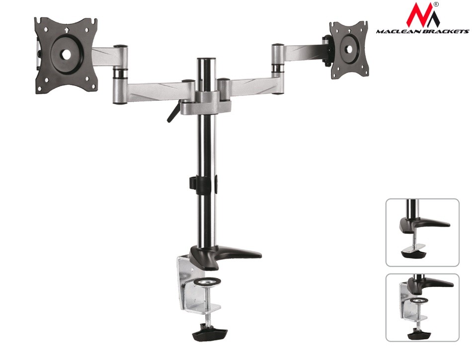Uchwyt biurkowy do dwóch monitorów LCD Maclean MC-714 13-27" 8kg aluminiowy Uniwersalny uchwyt biurkowy na wysięgniku służy do montażu dwóch telewizorów LCD, LED oraz monitorów różnych marek o wadze do 8kg i o wymiarach przekątnej ekranu od 13" do 27" . Podany rozmiar ekranu jest tylko propozycją. Na uchwyt można zamontować większy telewizor, gdy nie przekracza on maksymalnej wagi oraz mieści się w podanym standardzie VESA.