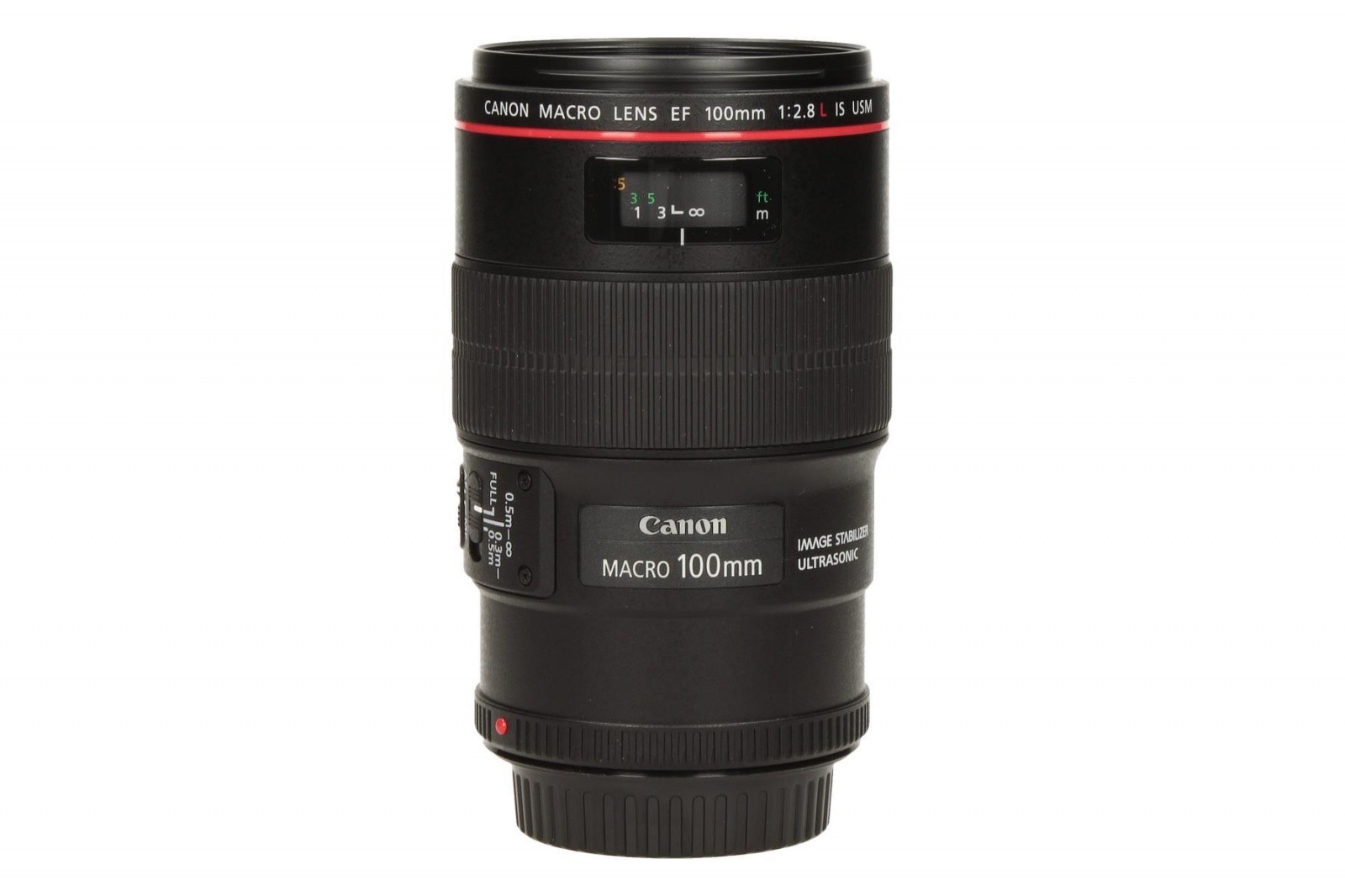 Canon EF 100mm f/2.8L Macro IS USM Lens. Component for: SLR, Lens structure (elements/groups): 15/12, Lens type: Macro lens. AF actuator: Ring USM, Compatibility: Canon EOS. Product colour: Black. Diameter: 7.77 cm, Filter size: 6.7 cm, Length: 123 mm. Magnification: 1x