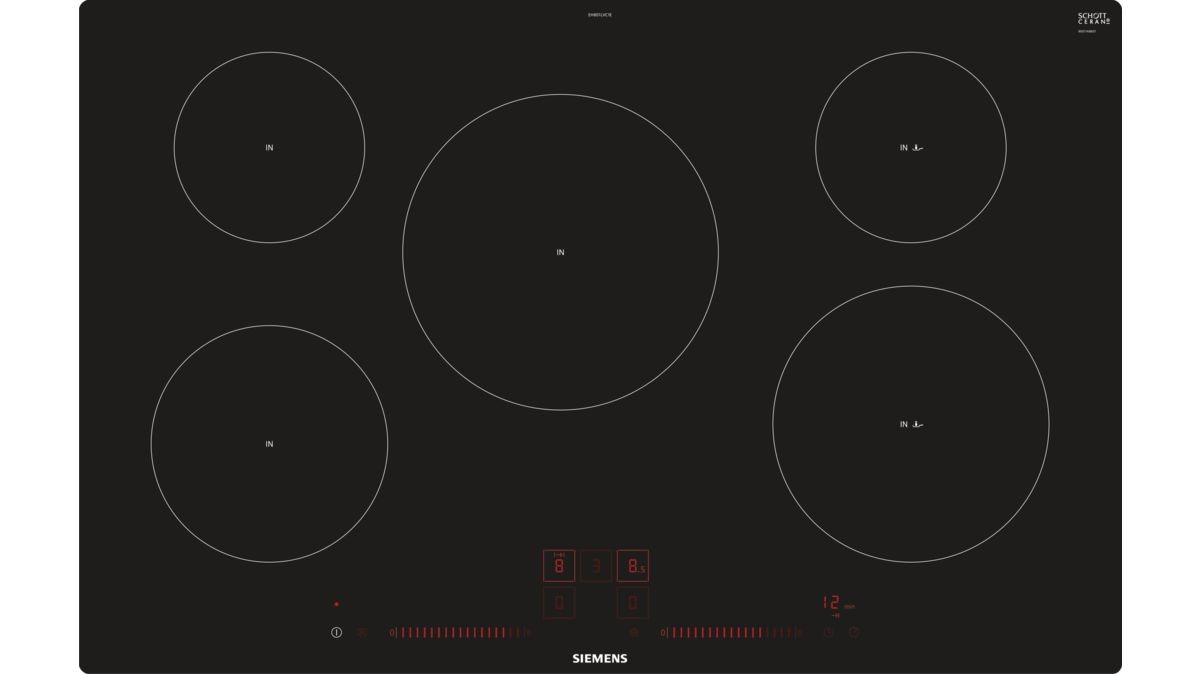 | Siemens EH801LVC1E. Product colour: Black, Appliance placement: Built-in, Hob type: Zone induction hob. Simmer cooking zone: 2200 W, Regular cooking zone: 3100 W, Large cooking zone: 3700 W. Control type: Touch, Control position: Top front. Connected load (electric): 7400 W, AC input voltage: 220-240 V, AC input frequency: 50 - 60 Hz. Width: 792 mm, Depth: 512 mm, Height: 56 mm |