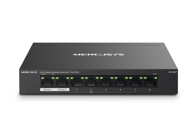 MS108GP Przełącznik typu Desktop, 8 portów gigabitowych, w tym 7 portów PoE+ - Gigabitowe porty: 8 portów RJ45 10/100/1000 Mb/s