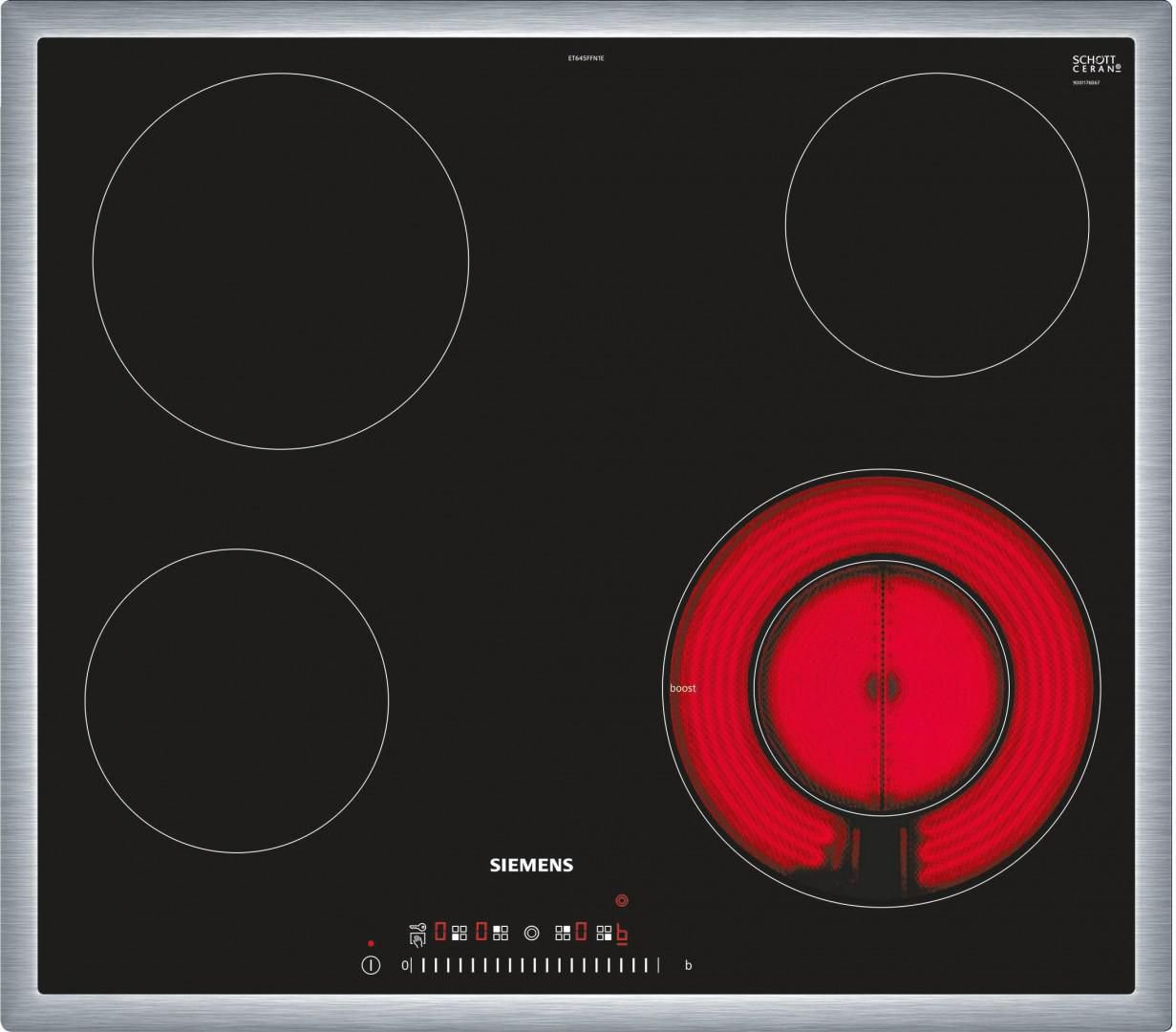 | Siemens iQ300 ET645FFN1E. Product colour: Black, Appliance placement: Built-in, Hob width size: 60 cm. Simmer cooking zone: 1200 W, Regular cooking zone: 2000 W, Large cooking zone: 2100 W. Control type: Touch, Control position: Top front. Connected load (electric): 7000 W, AC input voltage: 220 - 240 V, AC input frequency: 50 - 60 Hz. Width: 583 mm, Depth: 513 mm, Height: 48 mm |