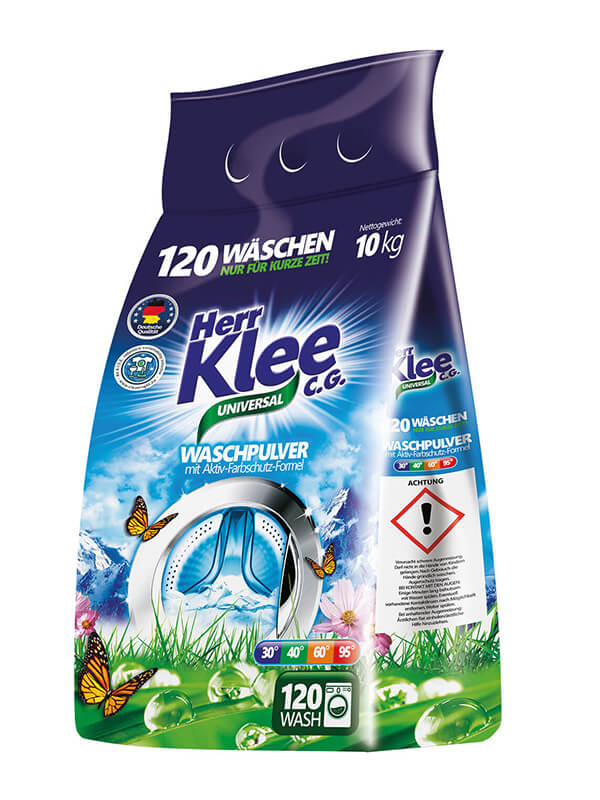 | Veļas pulveri Herr Klee Universal var izmantot gan baltiem, gan krāsainiem audumiem. Tas ir ārkārtīgi efektīvs. 10 kg iepakojums ir pietiekams līdz 120 mazgāšanas reizēm. Pulverim ir pārsteidzošs, svaigs aromāts. Veļas pulveris ļoti labi šķīst ūdenī. Tas neizraisa alerģijas un nekairina ādu. Herr Klee Universal satur atkaļķošanas līdzekli, tāpēc mazgājot nav nepieciešams papildus izmantot atkaļķošanas līdzekli. Mazgāšanas temperatūras diapazons no 30°C līdz 95°C. |